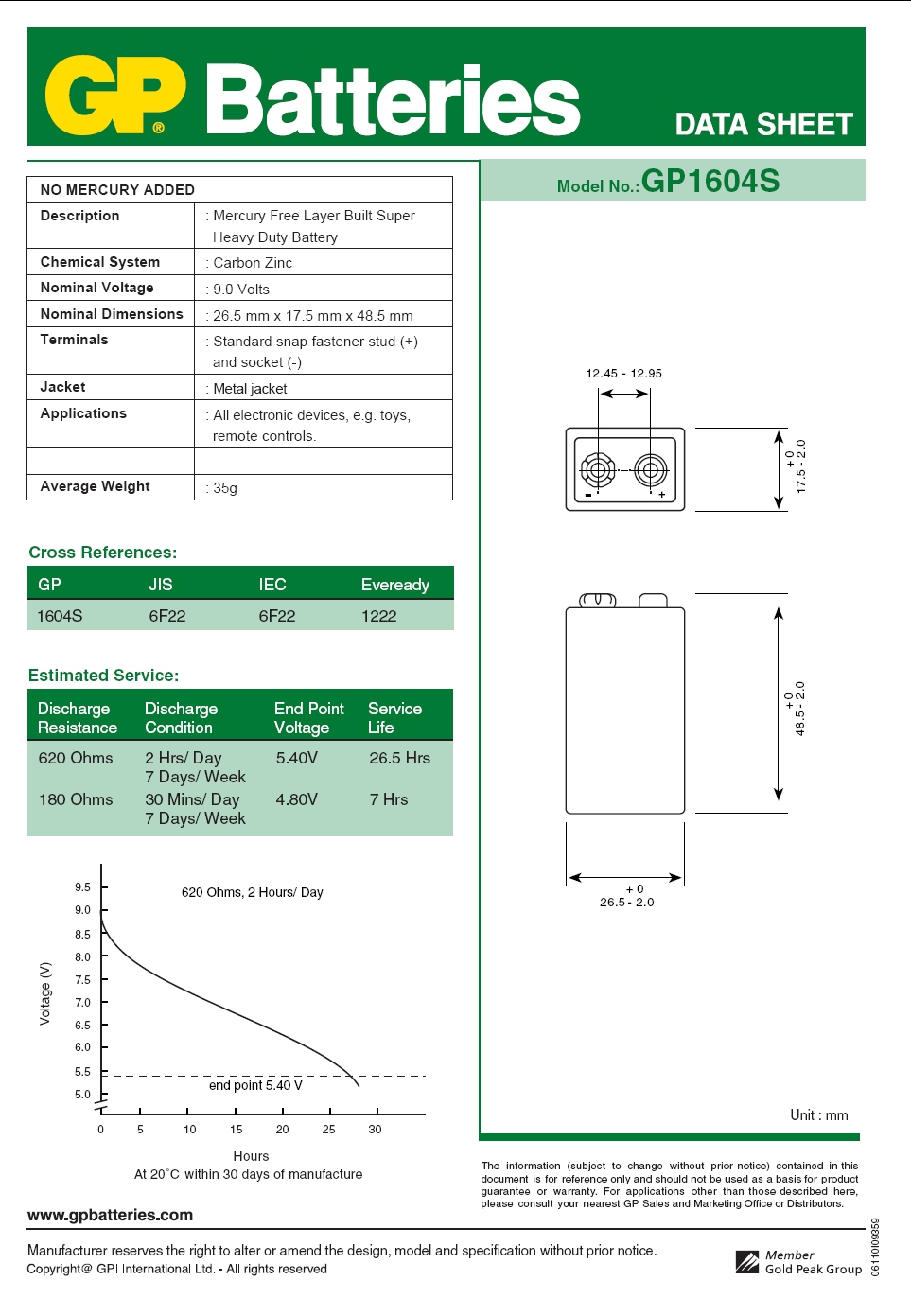 Солевая батарейка GP Supercell 6F22/1604S-2UE1