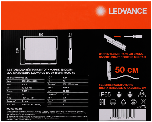Прожектор светодиодный FL ECO 100W 765 230 BK 105° IP65 G4 LEDVANCE